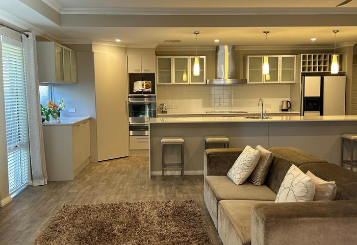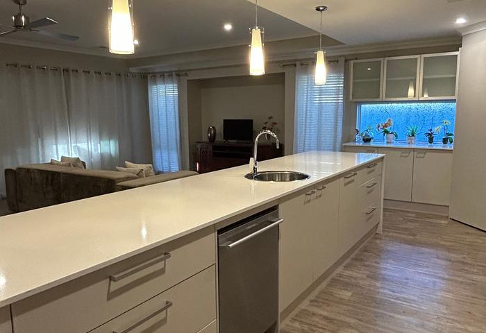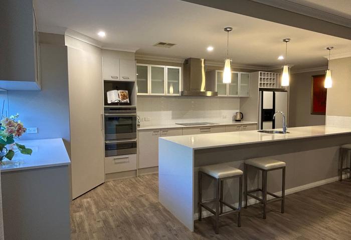 The kitchen features enormous stone bench tops, the main featuring a breakfast bar with waterfall end. Long cabinets provide multiple banks of large drawers and plenty of cupboards, along with the numerous glass front overhead cupboards. With a stainless steel double oven, 900mm ceramic cooktop under a ducted range hood, and plenty of preparation area, family meals can be an enjoyable collaboration. Let the quiet dishwasher take care of the clean up for you.