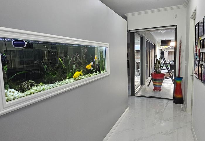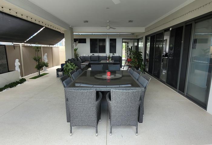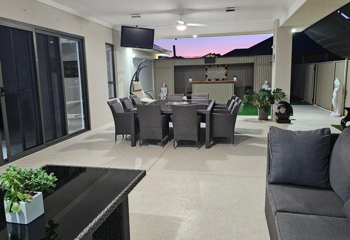 - Expansive outdoor entertaining area with easy-to-maintain garden surrounded by aggregate concrete flooring with outdoor bar and large water feature