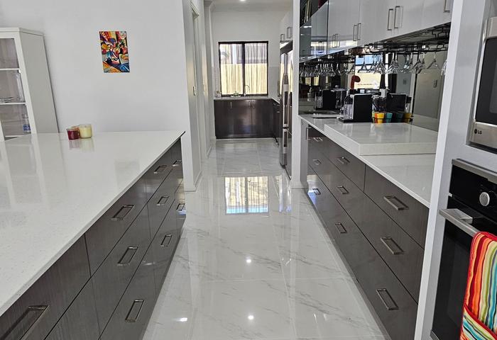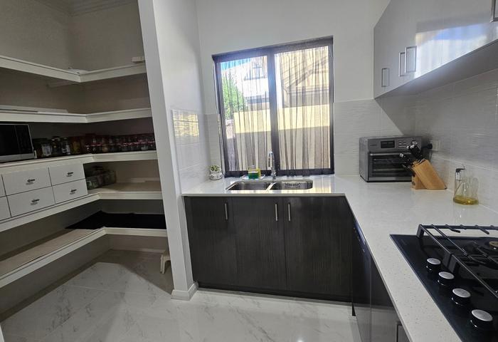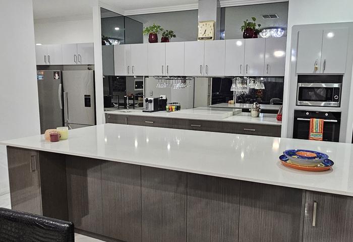 - Modern kitchen with high-end appliances, ample cabinetry and drawers, sleek stone countertops and mirrored splash back