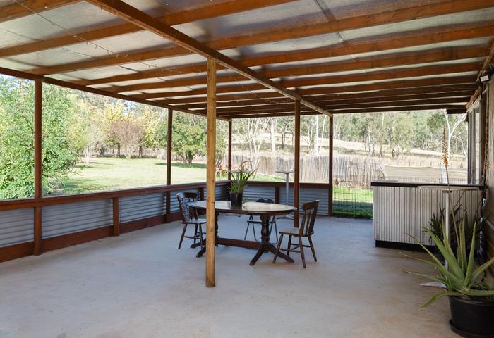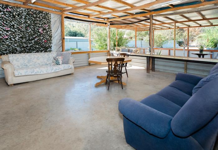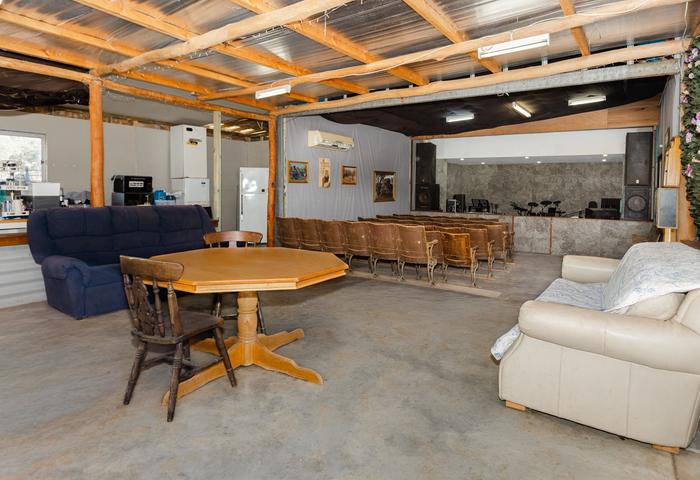This standout feature includes a fully powered band/music stage with downlights and acoustic carpet tiling. The adjoining barn-style area is perfect for audiences, dining, dancing, or parties, with PVC outdoor blinds on two walls for flexible indoor/outdoor use. It features rare heritage cinema seats from the early 1900s. Additional highlights: a roofed alfresco area with natural timber detailing, a bush kitchen with stainless steel sink and wall oven, and a full bathroom with shower and toilet. At the rear, framed rooms (one already finished as a carpeted bedroom) offer potential for storage or further accommodation. Another chicken coop is located in the adjoining paddock.