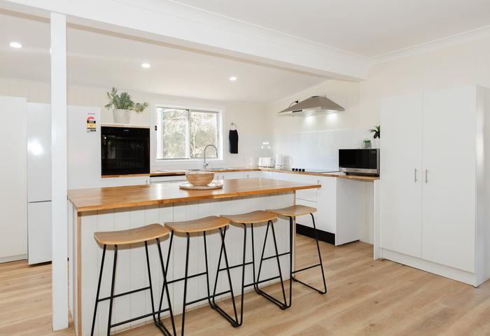 Timber frame, fully re-roofed, with open-plan kitchen, dining, and living areas.