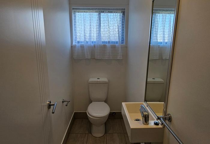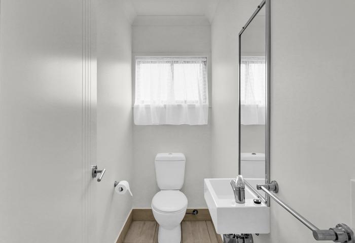 Enjoy the convenience of a two-way bathroom, complemented by a separate powder room for visitors.