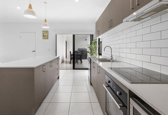 At the centre of the home sits a sleek and highly functional kitchen designed for both everyday life and entertaining. Featuring a generous island bench with breakfast bar seating and a full walk-in pantry, the kitchen flows seamlessly into the open plan living and dining space - the true heart of the home. Comfort is assured year-round with ducted air conditioning throughout.