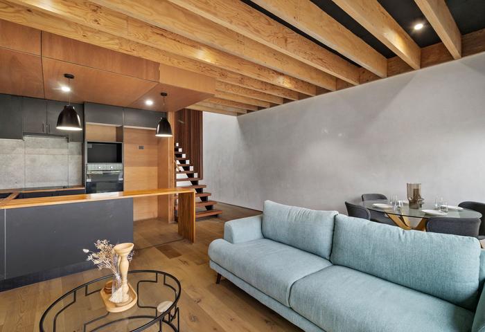 Step inside to interiors that are calm, natural and full of light. Feature walls and soft plywood finishes complement the flooring and LED downlights, while soaring ceilings lined in elegant marine ply create a warm, open feel. The striking timber staircase, complete with subtle LED lighting, ties both levels together with style.