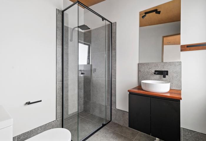 The main bathroom is a showstopper, featuring matte black fixtures, a skylight, and a freestanding bath. A section of the shower is designed for a future sauna, a nod to what’s possible in this thoughtful design. The floating vanity with a timber benchtop continues the home’s natural palette, and a downstairs powder room set behind a barn style door offers further convenience.