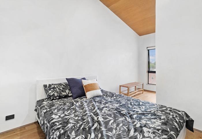 Upstairs, the main bedroom sits beneath a pitched ceiling with a built-in wardrobe. The ensuite showcases refined simplicity with a floating vanity featuring a timber benchtop an above mount basin and soft close cabinetry, plus a shower.