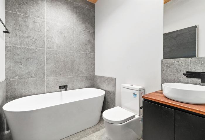 - An ensuite to the main plus a family bathroom, both including floating vanities with timber benchtops and showers with rain showerheads, a freestanding bath and a space off the shower designed for a future sauna to the main, plus a downstairs powder room