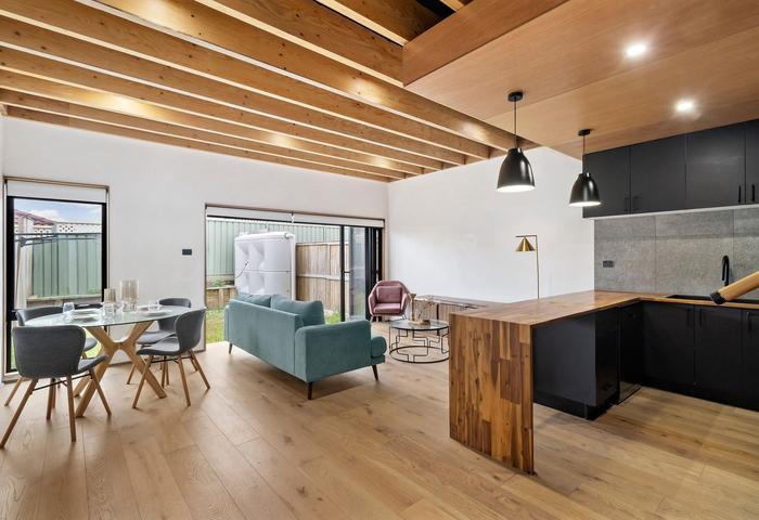 The open plan living and dining area flows seamlessly beneath exposed timber beams, with a glass stacker door opening to a low maintenance, fully fenced yard.