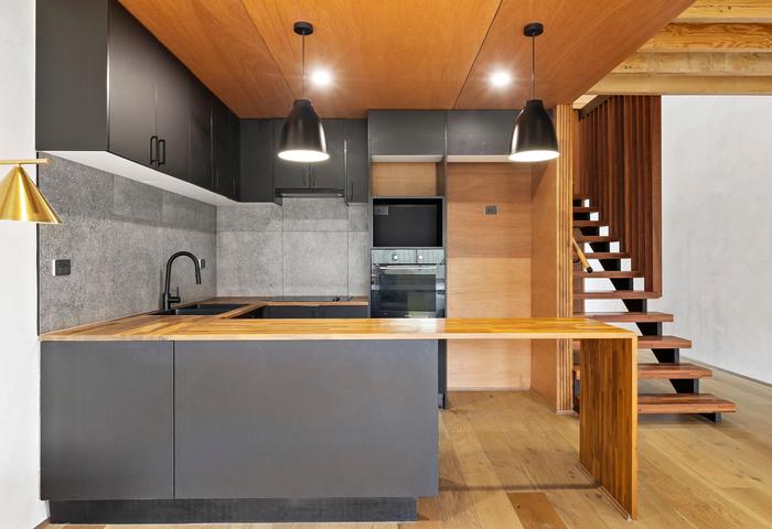 - A stunning kitchen featuring 30mm timber benchtops, a matte black dual sink with a mixer tap, pendant lighting, a large format tile splashback, power points with USB ports, and quality appliances