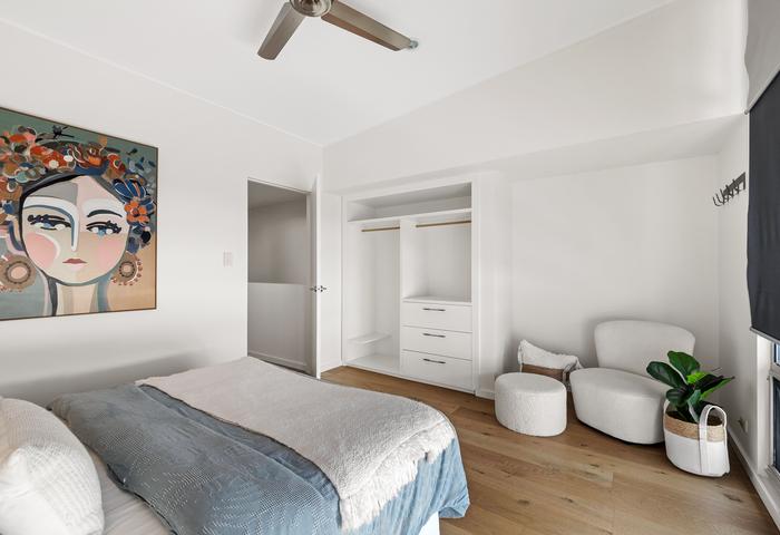 Upstairs, you’ll find two spacious bedrooms, upgraded with engineered timber flooring and custom built-in robes for maximised storage. A modern bathroom with separate toilet, and a large linen cupboard highlights that this home delivers functional living with plenty of clever storage and low-maintenance ease.