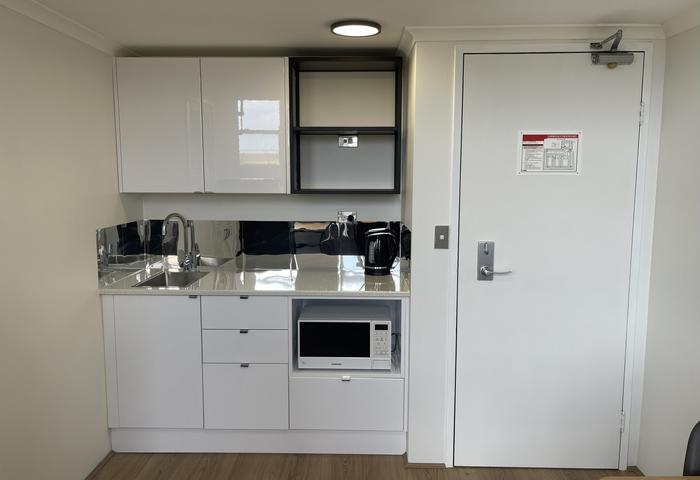 - Kitchenette with black 197L fridge/freezer, portable induction cooktop and all kitchenware