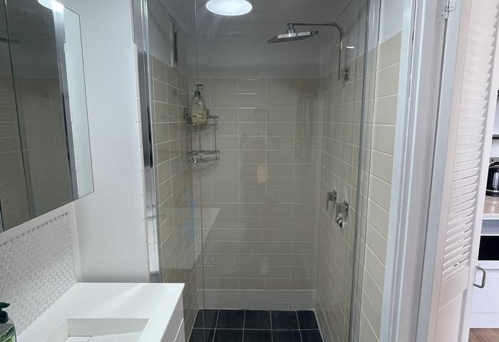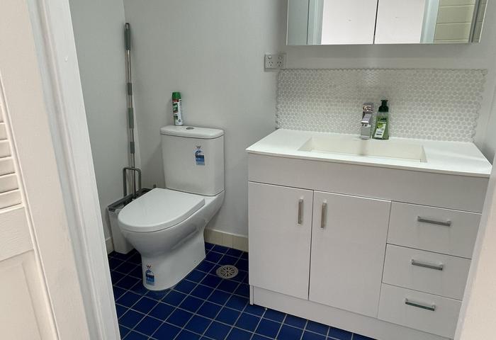 - Bathroom with glass shower screen, vanity, mirror cabinet, and new toilet