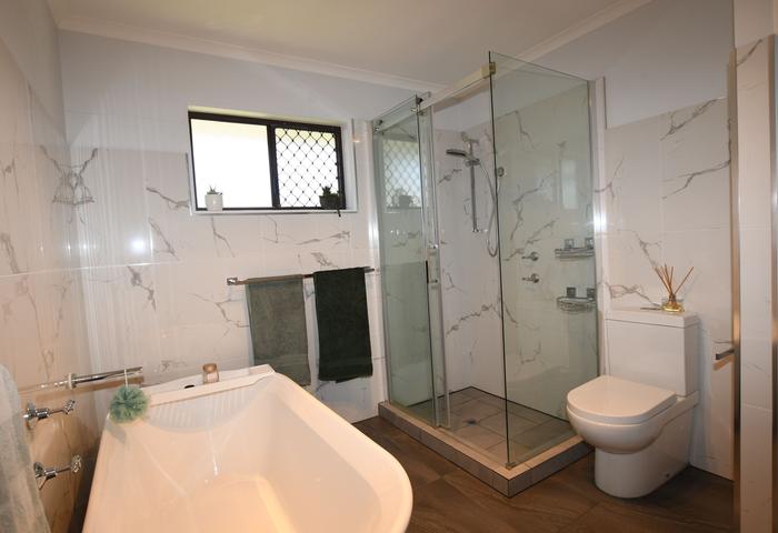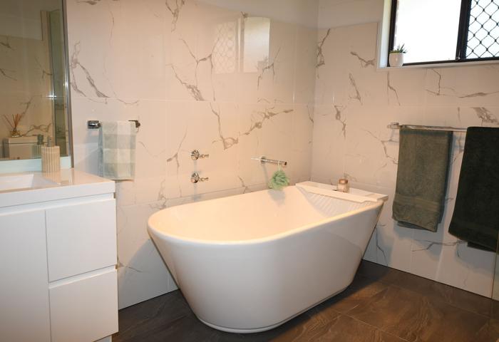 Luxurious fully renovated bathroom featuring a stunning freestanding bathtub, large walk-in shower, vanity, and fresh marble-style tiling throughout.