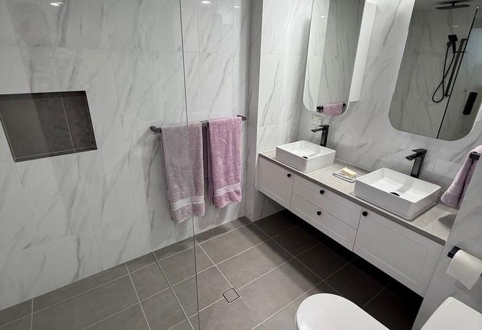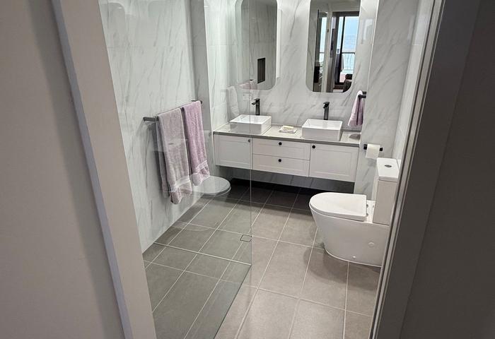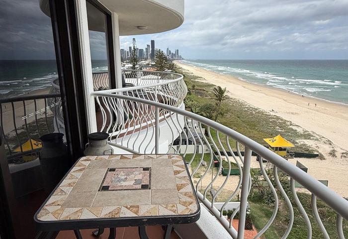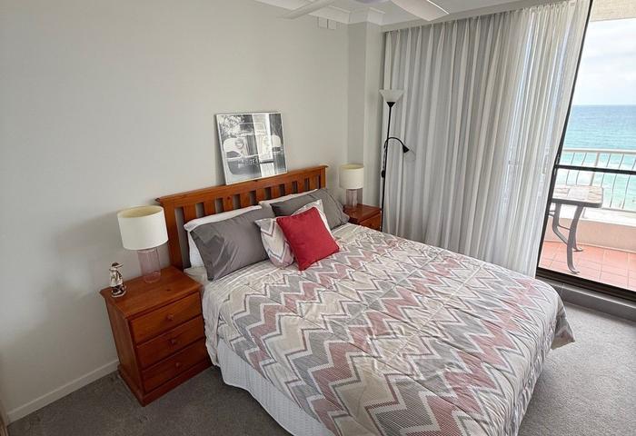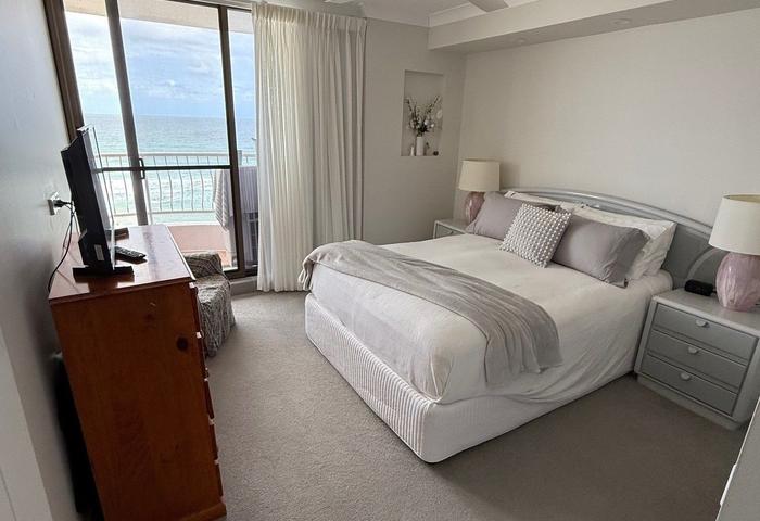 Featuring **2 spacious bedrooms** with **built-in robes**, and **2 modern bathrooms**, the unit provides ample space for relaxation and privacy. The open **living area** seamlessly connects to a private **balcony**, ideal for hosting friends or enjoying serene uninterrupted beach and ocean views north and south.