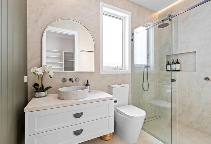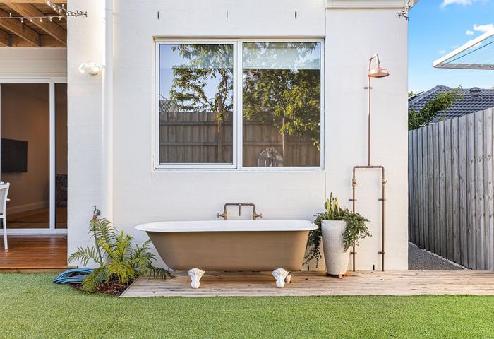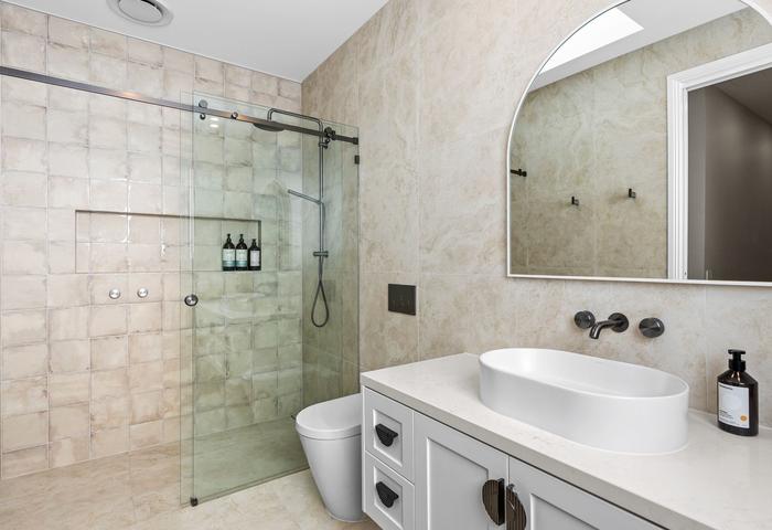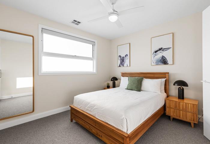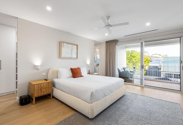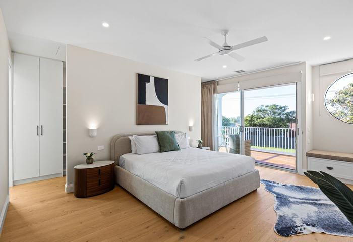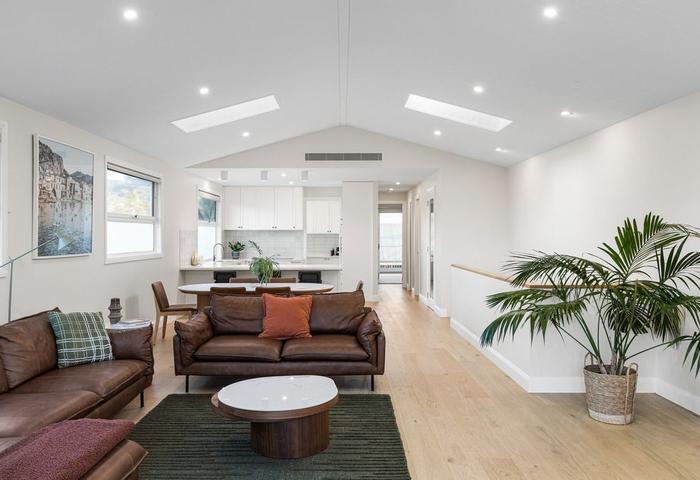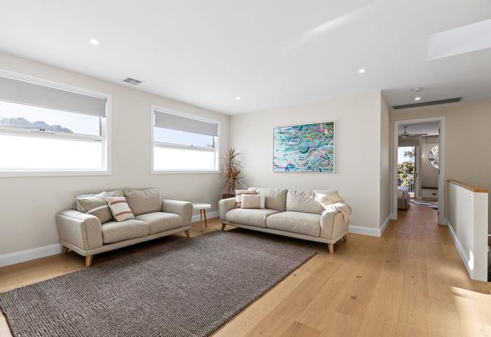 Upstairs, the tranquil main bedroom features a private timber deck, walk-through robe and design-led, light filled ensuite with skylight. An additional lounge area, powder room and two generous bedrooms — serviced by a beautifully appointed, marbled central bathroom with freestanding bath — complete this level.