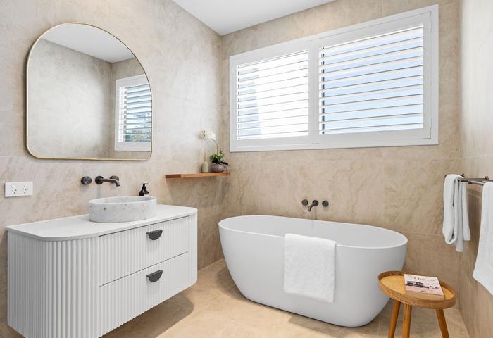 Retreat to the second level in a large and light filled main bedroom with a private timber deck and walk through robe. A light filled bathroom with floor to ceiling tiles, skylight over the large shower and stone vanity. The second level also features an additional lounge area, powder room and two additional, generously sized bedrooms that are serviced by a central bathroom detailed in full-height marbled tiling and a freestanding bath.