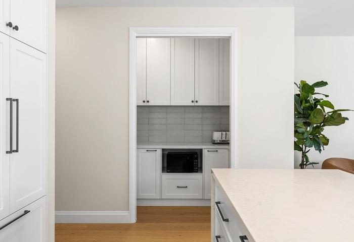 An entertainer’s delight, defined by an oversized stone island bench/breakfast bar, the gleaming gourmet kitchen is the home’s entertaining hub. Incorporating a butler’s pantry and all Smeg appliances including an induction cooktop and oven, integrated dishwasher and fridge/freezer. Light European timber floors run throughout the home, while crisp walls and oversized windows with sheer linen curtains fill the space with natural light. With the main living area on the ground level, glass sliding doors open to incorporate the alfresco deck and fully tiled, heated pool and a low maintenance garden.