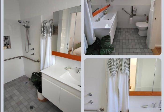 * tidy bathroom with safety handrails, non-slip tiles & new shower screen