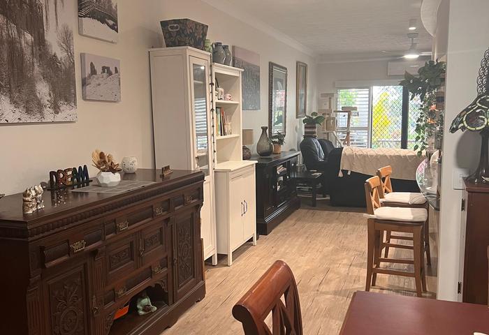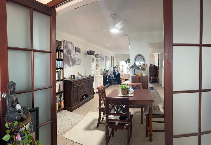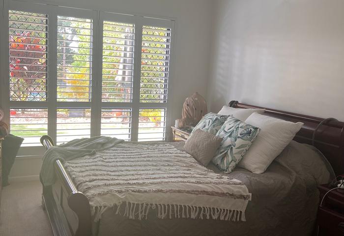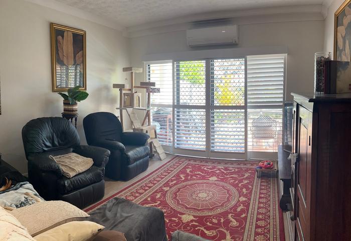 The residence includes two modern bathrooms, a welcoming living area, plantation shutters throughout, and a well-equipped kitchen with a dishwasher.