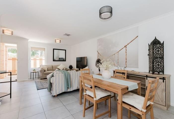 This light-filled home boasts an open-plan living/dining area leading on to a stunning kitchen perfect for everyday living. With three comfortable bedrooms (2 with built in robes) and a modern bathroom, it provides ample space. Outdoors there is a relaxing patio with a retractable arm awning for shade, green space and an included water feature providing a peaceful and welcoming atmosphere. Additionally, there is a private courtyard at the front of the property ideal for your morning coffee. Parking is a breeze with a dedicated carport, offering secure and convenient parking with an electric gate.